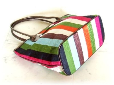 7色使いのカラフルなイタリアンデザイン!英字ジャガードのオシャレなバッグです。両サイドにマグネットポケットが付いた3室式で使い勝手good!