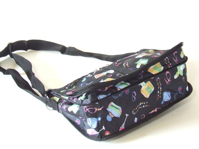 香水や指輪、ネックレス、メガネなどのファッション小物がプリントされた、オシャレなデザインのショルダーバッグです。ツルツルした手触りのナイロン素材で、少々の水ならはじいてくれます。サイドのファスナーでマチ幅が広がり荷物が増えても安心。2室構造で使い勝手もgood!ちょっとオシャレな普段使いバッグにオススメです♪