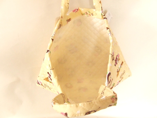 ケーキやクレープなどがプリントされた可愛いキルティングトートバッグです。A4ファイルがスッポリ入るので、通学やレッスンバッグにお使いいただけます。