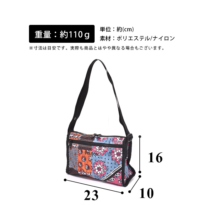 スマホやマスクケースの収納に便利な前ポケット付きのミニショルダーバッグです。ショッピングやお散歩などアクティブなお出掛けにもぴったりサイズ。インパクトたっぷりの大柄のデザインで収納力も抜群。汚れを気にせず、デイリーユースに役立ちます。洗濯ネットに入れてご家庭の洗濯機でお洗濯可能。とにかく軽いので楽ちんです♪