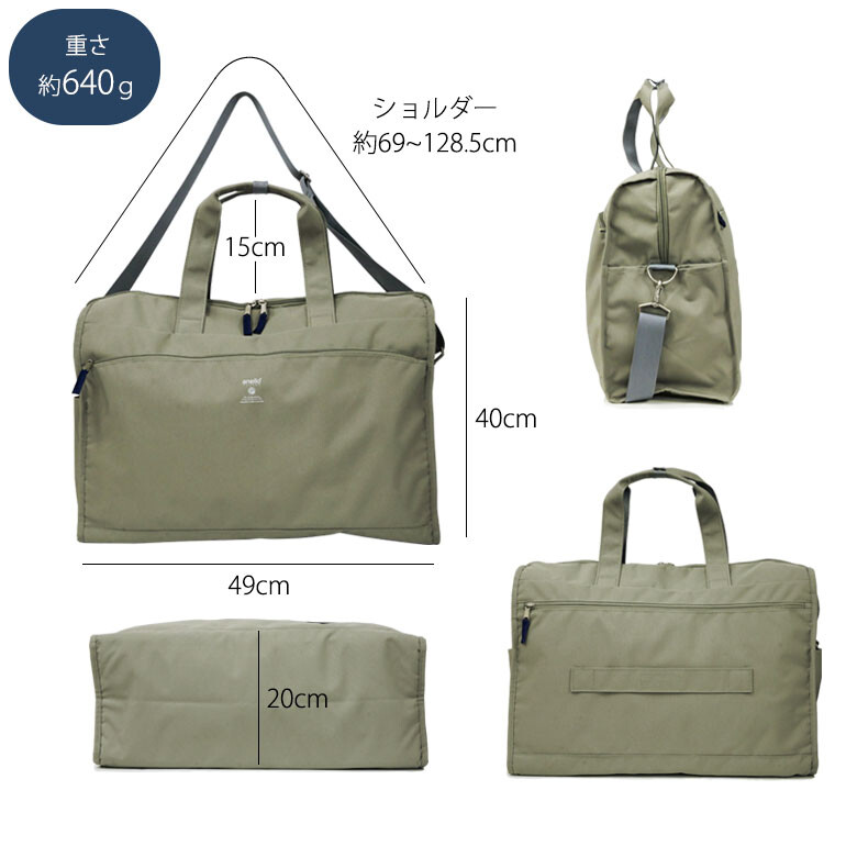 アネログランデ軽量撥水10ポケットキャリーオン2WAYボストンバッグです。35Lの容量で2〜3泊の旅行にぴったりのサイズ。内側にはオープンポケットが2つ、ペン差しが1つ、メッシュポケットが1つあり、小物の整理もしやすい!前面と背面、両サイドにもポケット付き。10ポケットの多収納設計。A3サイズも余裕で入る、大容量の収納力!さらに背面にはキャリーオンベルトが付いているのでキャリーケースの持ち手に通して移動もらくらく♪撥水加工を施しているので多少の雨でも安心。どなたでも使いやすいシンプルなデザイン。